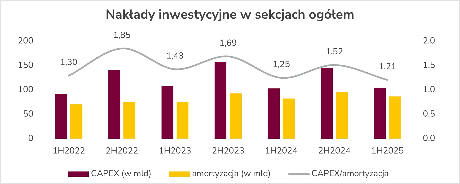 Firmy wciąż utrzymują wysoki poziom płynności, choć nieco niższy niż w poprzednim roku. To efekt ostrożności finansowej po kilku latach niestabilności gospodarczej, wysokiej inflacji i kryzysu energetycznego. Nakłady inwestycyjne w analizowanym półroczu pozostawały na niskim poziomie, a relacja CAPEX do amortyzacji osiągnęła najniższy poziom od czterech lat. Wynikało to zarówno z ograniczonego popytu, wysokich stóp procentowych, opóźnienia w wydatkowaniu środków z Krajowego Planu Odbudowy oraz nowej perspektywy unijnej. Wyjątkami były rolnictwo (+15,7 proc. r/r), budownictwo (+17,5 proc. r/r) oraz opieka zdrowotna (+20,2 proc. r/r), gdzie zanotowano wzrosty inwestycji w aktywa trwałe.
