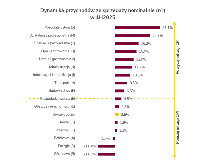 Największe przychody generowały przemysł i handel, odpowiadające łącznie za ponad 2/3 wartości sprzedaży w gospodarce. Jednak w większości sekcji wzrost przychodów nie przekroczył wartości inflacji CPI, co podkreśla trudne otoczenie rynkowe. Sektory usługowe radziły sobie lepiej niż produkcyjne, co odzwierciedlało charakter popytu w tym okresie.