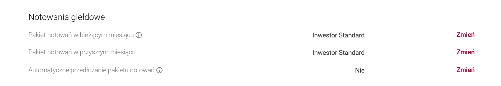 2. Pakiet notowań w przyszłym miesiącu - W tym miejscu wybierzesz pakiet na przyszły miesiąc. Możesz go zmienić w każdej chwili – wystarczy że klikniesz „Zmień” i zatwierdzisz zmianę pakietu.
