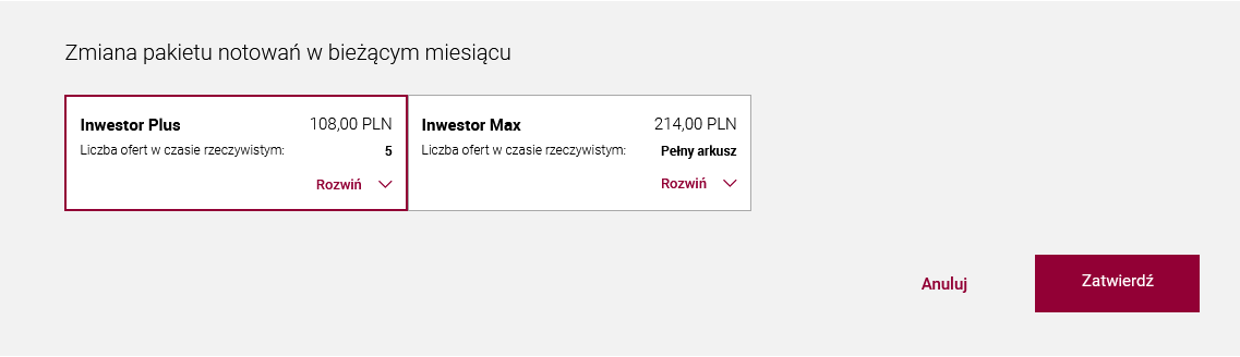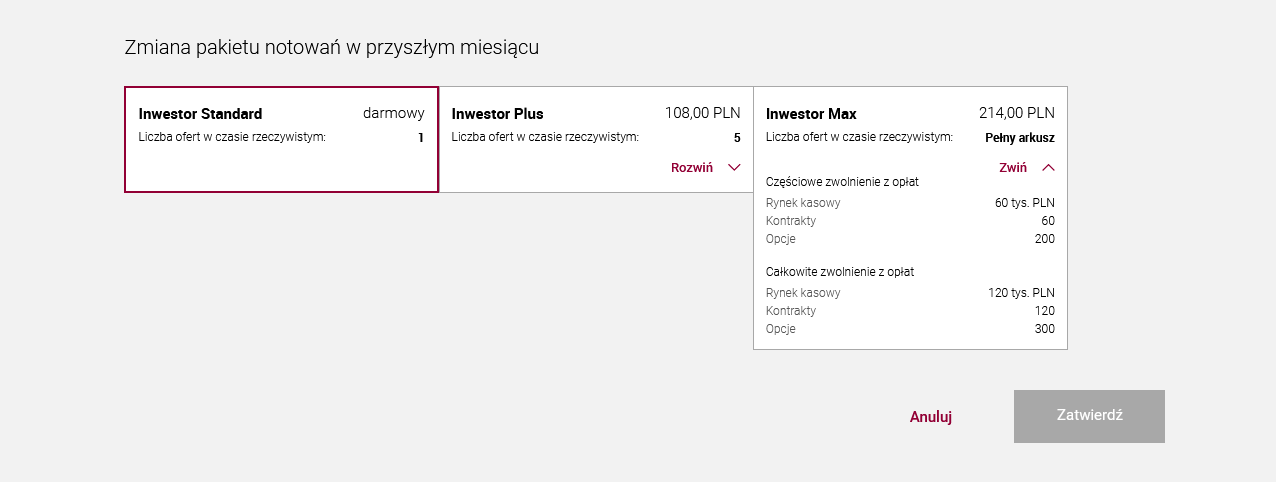 Jeśli na Twoim rachunku nie będzie zarejestrowanej wystarczającej wartości obrotów/liczby transakcji, za pakiet Inwestor Plus zapłacisz 108 zł, a za pakiet Inwestor Max – 214 zł. Jeśli wykonasz minimalną wartość obrotów/liczby transakcji, określoną dla danego pakietu, będzie on dla Ciebie dostępny bezpłatnie – wtedy zamiast ceny zobaczysz informację „darmowy”.