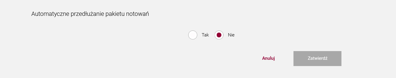 3. Automatyczne przedłużanie pakietu notowań - w tym miejscu możesz wybrać czy chcesz, żebyśmy automatycznie przedłużali wybrany przez Ciebie pakiet notowań. Masz do wyboru dwie opcje: Tak lub Nie. Jeśli wybierzesz opcję: