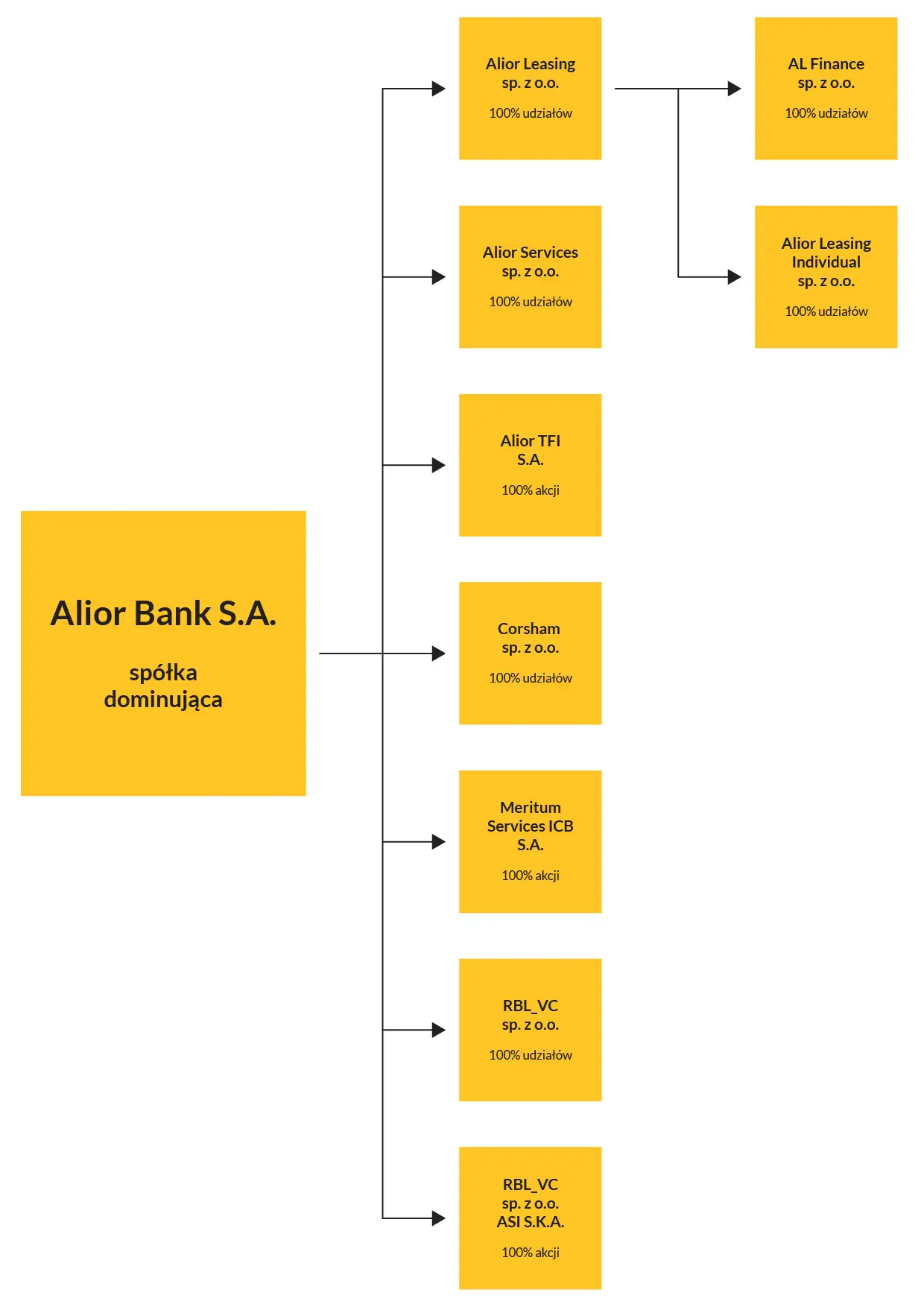 Prowadzi działalność operacyjną od października 2015 r. Oferuje leasing operacyjny, finansowy i pożyczkę leasingową. Przedsiębiorcy uzyskują łatwy i szybki dostęp do środków transportu oraz maszyn i urządzeń. Alior Leasing posiada liczną sieć sprzedaży oraz współpracuje z rozległą siecią partnerów biznesowych, dealerów i vendorów, a także z siecią sprzedaży Alior Banku.10% udziałów AL Finance sp. z o.o. Firma współpracuje głównie z osobami fizycznymi prowadzącymi działalność gospodarczą i firmami z sektora MŚP. Spółka planuje stopniowy rozwój nowej sprzedaży do klientów biznesowych z wyższych segmentów oraz w sektorze przetwórstwa przemysłowego i opieki zdrowotnej. Alior Leasing wykorzystuje też potencjał istniejącego portfela klientów i realizuje działania związane z pre-aproved oraz rozwija ofertę leasingu maszyn i urządzeń. Na bazie silnika decyzyjnego Alior Leasing uruchomił funkcję automatycznej decyzji leasingowej, co pozwoliło zoptymalizować proces oceny ryzyka transakcji oraz wprowadzić nowe funkcjonalności w Portalu Klienta.AL Finance Sp. z o.o.