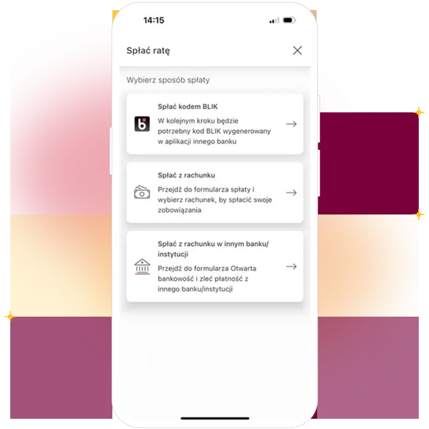 Zasady korzystania z usługi „Spłata raty BLIK” znajdziesz w „Regulaminie korzystania z usługi „Spłata raty BLIK” w Aplikacji Mobilnej”.