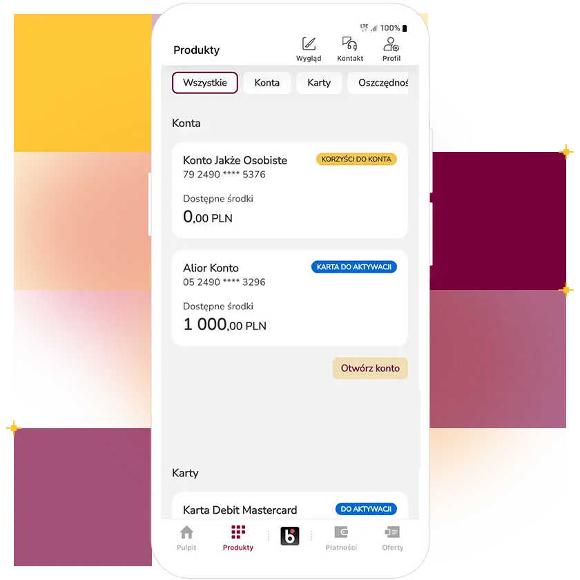- Konta, karty i oszczędności – pełną listę swoich produktów widzisz od razu.