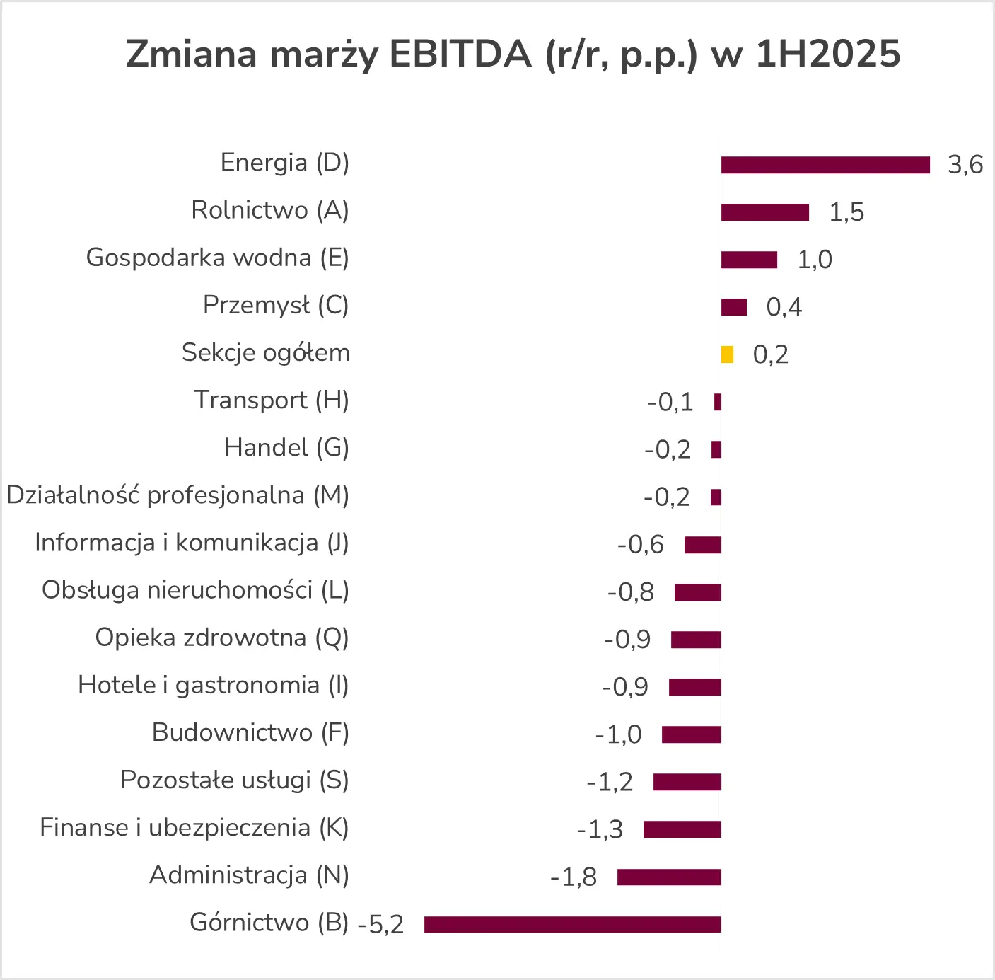 W pierwszym półroczu 2025 roku przedsiębiorstwa w Polsce nadal odczuwały skutki niewystarczającego popytu krajowego, co wpłynęło zarówno na przychody, jak i rentowność. W ujęciu ogółem przychody ze sprzedaży wyniosły prawie 2,91 bln zł, co oznacza wzrost o 2,5 proc. w porównaniu do pierwszej połowy 2024 roku. Marża EBITDA wzrosła nieznacznie o 0,2 p.p. do 8,2 proc., ale wciąż pozostaje poniżej potencjału, zwłaszcza w przemyśle, gdzie ograniczony popyt krajowy hamuje rozwój.