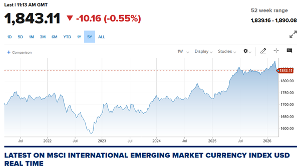 Wykres 4. Wykres indeksu MIEM00000CUS – koszyk walut EM względem USD za ostatnie 5 lat