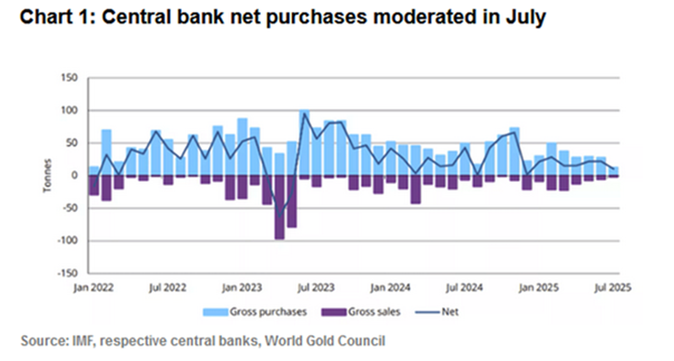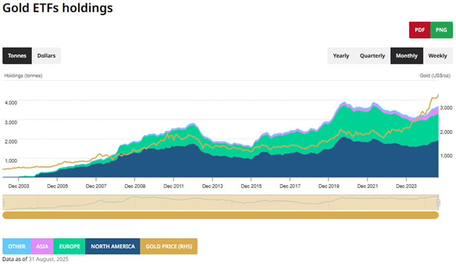 Fakt, że uważamy, że w krótkim terminie istnieje wysokie ryzyko korekty, nie zmienia naszego pozytywnego nastawienia do kruszcu w średnim i długim horyzoncie czasowym, ponieważ fundamentalne czynniki, stojące za wzrostem cen kruszcu pozostają niezmienione. Nadal żyjemy w czasach bardzo niestabilnych geopolitycznie, co w naturalny sposób napędza popyt na kruszec. W związku z tym popyt na fizyczne złoto inwestycyjne i wyroby jubilerskie pozostaje stabilny. Raportowany przez banki centralne popyt na złoto do rezerw utrzymuje się na wysokim poziomie, a napływy do ETF-ów na kruszec cały czas rosną. Równocześnie ilość złota którą zgromadziły fundusze, nadal pozostaje poniżej rekordów z okresu pandemii (2020) i wybuchu wojny na Ukrainie (2022).