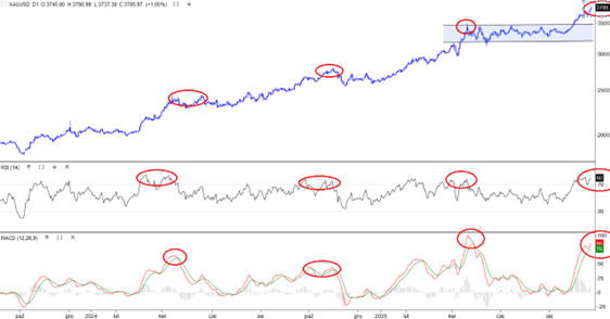 Wykres 4. Oscylator RSI i MACD sugerują silne wykupienie rynku złota.