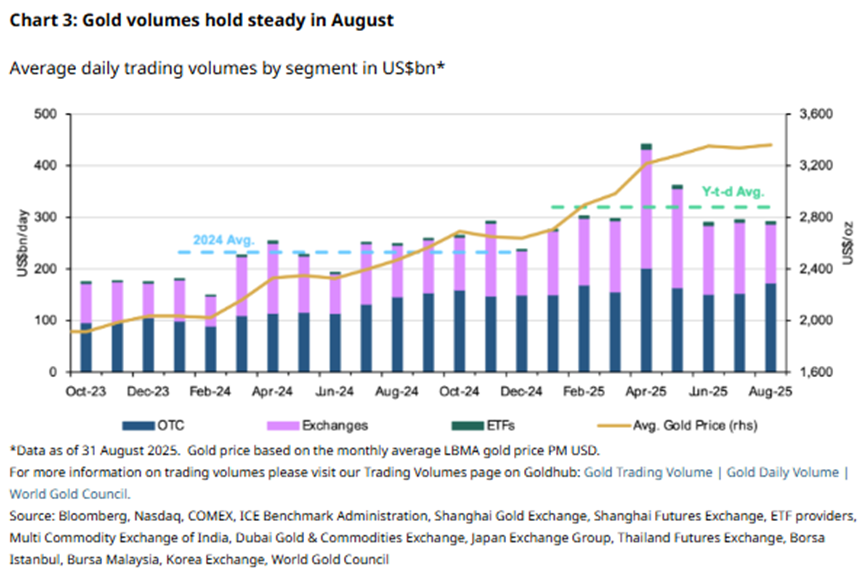 Dodatkowo z wyliczeń przedstawianych przez World Gold Council wynika, że wolumeny handlowe na giełdach i OTC (głównie forex) pozostają w ostatnich miesiącach zdecydowanie podwyższone. Pokazuje to wzmożoną aktywność graczy handlujących nie tyle złotem fizycznym, co „papierowymi” jego odpowiednikami.