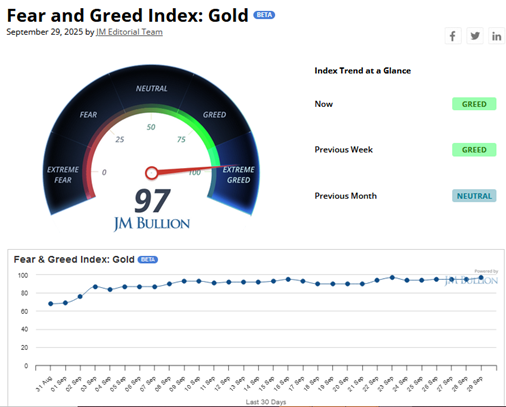 To co jednak dostrzegamy to fakt, że obecny rajd cen kruszcu doprowadził do niespotykanej skali optymizmu na rynku, a podejmowanie działań o charakterze kontrariańskim (słynne „bój się kiedy inni są chciwi, bądź chciwy kiedy inni się boją”), często okazuje się strategią pozwalającą osiągać bardzo dobre wyniki inwestycyjne. W momencie powstania tego artykułu (30.09.2025), złoto osiąga swoje kolejne historyczne maksimum, przebijając cenę 3870 USD/uncja. Równocześnie mierzony przez stronę internetową JM Bullion indeks Fear & Greed dla złota pokazuje poziom 97 punktów, świadczący o ekstremalnej chciwości panującej na rynku.