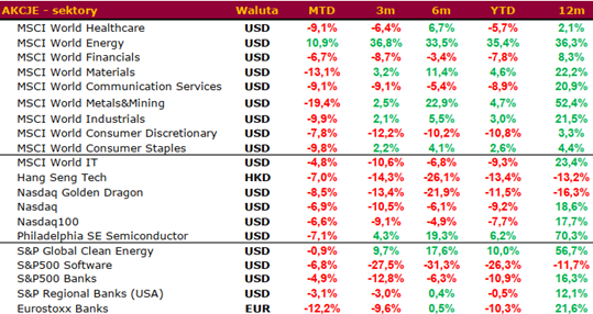 - ETF-y czystej energii (np. ISHARES GLOBAL CLEAN ENERGY) odnotowały silne wzrosty r/r, przewyższając dynamikę wielu sektorów globalnych.