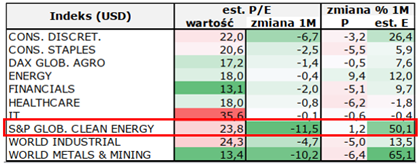 Prognozy zysków dla sektora Global Clean Energy w ostatnim miesiącu uległy znaczącej poprawie. Jednocześnie sektor ten nie należy do tanich na tle pozostałych - prognozowane P/E wynosi aktualnie 23,8. Oznacza to, że inwestorzy płacą premię za oczekiwany wzrost, co zwiększa ryzyko krótkoterminowych korekt.