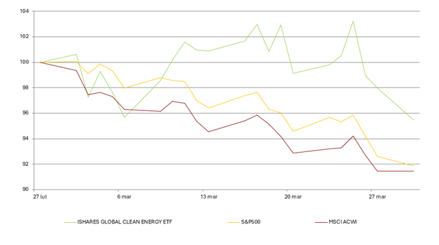 Wykres 1. Porównanie stóp zwrotu ETF Global Clean Energy do indeksu akcji globalnych i SP500 od początku konfliktu w Iranie w 2026 r.