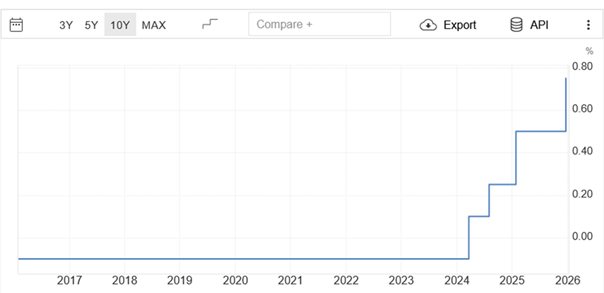 Podczas grudniowego posiedzenia Bank Japonii podjął decyzję o podwyższeniu głównej stopy procentowej o 0,25%, do poziomu 0,75%, najwyższego od 1995 roku. Tym samym polityka ta kontrastuje wyraźnie z decyzjami innych głównych banków centralnych, które na grudniowych posiedzeniach dokonały kolejnych obniżek stóp procentowych. Decyzje takie podjął FED obniżając stopy do poziomu 3,5%-3,75%, a także polski bank centralny redukując po raz kolejny główną stopę do poziomu 4%. Wcześniej o obniżkach do poziomu 2,15% zdecydował ECB.