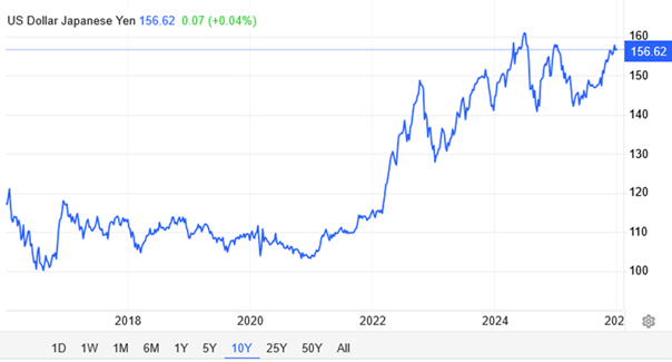 Podwyżka stóp procentowych nie przyczyniła się do wzmocnienia japońskiej waluty. Po decyzji Banku Japonii jen w relacji do dolara osłabił się ponad poziom 155. Tym samym kończąc rok na poziomach bardzo zbliżonych do styczniowych. Pierwsza połowa roku przyniosła znaczące wzmocnienie do poziomu 142. Natomiast wzrost inflacji w połowie roku ponownie osłabił jena w kierunku najwyższych poziomów od końca lat 80-tych.