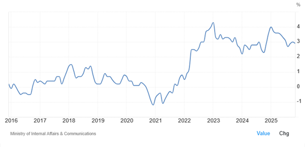 Decyzja Banku Japonii o zacieśnianiu polityki monetarnej związana jest z uporczywie utrzymującą się, podwyższoną inflacją. W listopadzie wyniosła ona 2,9% i od 44 miesięcy przekracza cel banku centralnego wynoszący 2%. Na inflację w bardzo dużym stopu wpływają wysokie ceny ryżu. W połowie bieżącego roku dynamika wzrostu tego podstawowego produktu żywnościowego przekroczyła poziom 100%, w relacji do roku poprzedniego. Ostatnio dynamiki te znacząco się obniżyły i wzrost cen ryżu w ujęciu rocznym wyniósł „tylko” 40%. Głównym czynnikiem takiego mocnego ruch w górę była susza i związane z tym dużo niższe zbiory.