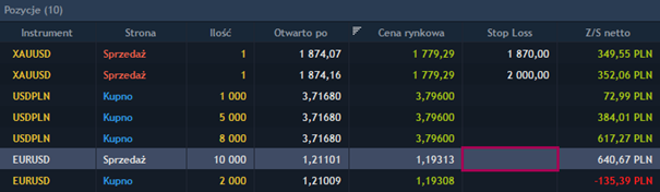 Każdą otwartą pozycję, a także zlecenie oczekujące możemy modyfikować w panelu Pozycje oraz w panelu Zlecenia bieżące. Przykładowo jeżeli chcemy zmodyfikować wartość Stop Loss dla otwartej pozycji, przechodzimy do panelu Pozycje gdzie klikamy w kolumnie Stop Loss (w poniższym przykładzie pozycja sprzedaży EURUSD o wolumenie 10 000).
