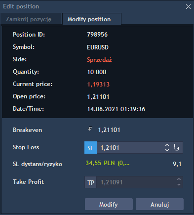 Po kliknięciu pojawi się okno modyfikacji pozycji, gdzie Inwestor może wpisać wybraną wartość Stop Loss a następnie zatwierdzić swoją dyspozycję klikając przycisk Modyfikuj. Analogiczne można dokonać zmiany lub ustawić na nowo zlecenie Take Profit (TP).