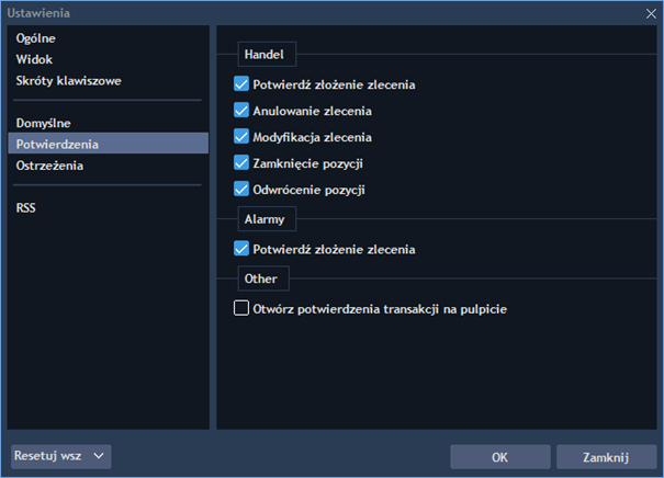 Zaznaczenie opcji w tej sekcji powoduje pokazywanie dodatkowych potwierdzeń przy składaniu poszczególnych rodzajów zleceń.