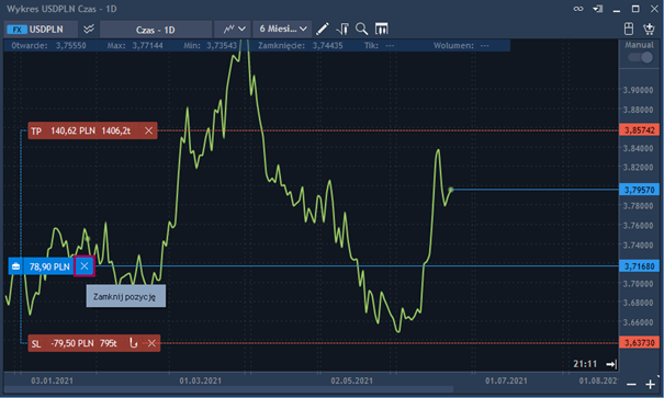 Zamknięcie pozycji z wykresu jest bardzo proste i intuicyjne. Wystarczy kliknąć znak „X” przy pozycji, którą chcemy zamknąć.
