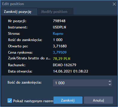 Następnie pojawi się okno potwierdzenia zamknięcia zawierające wszystkie informacje na temat pozycji wraz z możliwością wyboru ilości do zamknięcia. Wystarczy, że Inwestor potwierdzi dyspozycję klikając Zamknij.