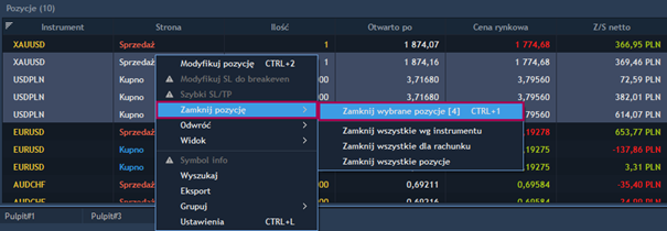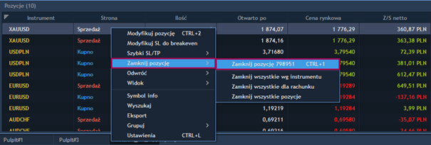 Innym sposobem zamykania pojedynczych pozycji jest kliknięcie prawym przyciskiem myszy na pozycji w panelu Pozycje. Rozwinięte zostanie wówczas podręczne menu, w którym wybieramy Zamknij pozycję, tak jak to zostało przedstawione na poniższej ilustracji.