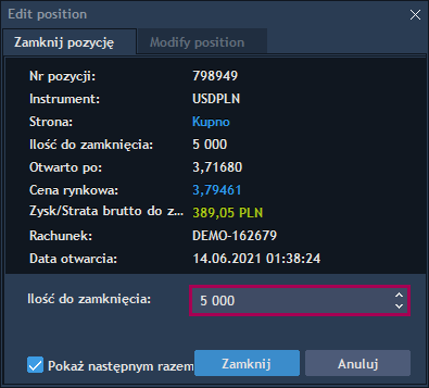 Jeżeli Inwestorowi zależy na bardzo szybkim zamykaniu pozycji, może odznaczyć opcję Pokaż następnym razem (lub w ustawieniach platformy odznaczyć opcję Potwierdzenia / Zamknięcie pozycji). Wówczas wystarczy kliknąć dwa razy na pozycję znajdującą się w panelu i zlecenie zamknięcia całej pozycji zostanie natychmiast złożone. W przypadku odznaczenia potwierdzeń, użytkownik nie będzie mógł zamykać częściowo pozycji.