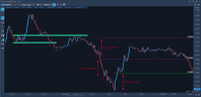 - Korekta ceny mierzona od dołka do lokalnego szczytu wynosi 17 pipsów. Inwestor ma więc świadomość, że przy kontynuacji trendu spadkowego, korekta ruchu w dół większa niż 17 pipsów może spowodować odwrócenie trendu.