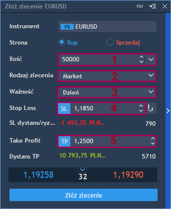 Poniżej przedstawiamy przykład złożenia zlecenia kupna instrumentu EUR/USD, typu Market (2), o wielkości 50 000 jednostek waluty bazowej (1), z dzienną ważnością zlecenia (3) i z ustawionymi wartościami SL(4), TP (5) w formie konkretnej ceny zleceń zamykających.