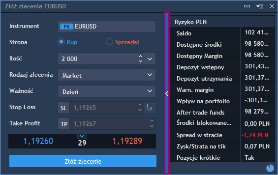 Po kliknięciu na niebieski pasek ze strzałką Inwestor ma także możliwość podglądu dodatkowych wartości związanych z ryzykiem zlecenia jak np.: depozyt wstępny, wartość spreadu, czy wartość prowizji.