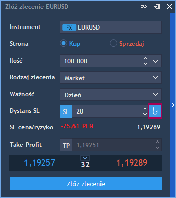 Przykładowe ustawienie zlecenia na parze EUR/USD o wielkości 1 lota z typem Market wraz ze zleceniem Trailing Stop z dystansem 20 pipsów przedstawia poniższa ilustracja: