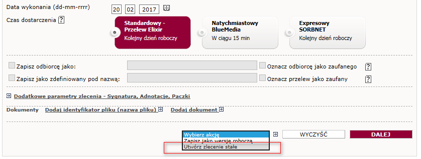 Wybierz zakładkę „przelewy” w górnym menu. Kliknij w pole „wybierz akcję” w dolnej części ekranu i wybierz „utwórz zlecenie stałe”