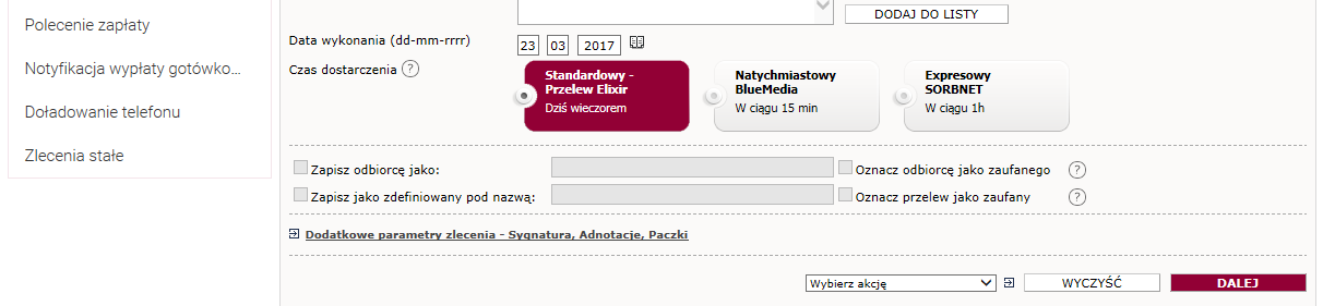 • przelewy/ nowy przelew (np. krajowy). Po uzupełnieniu danych przelewu należy rozwinąć sekcję „dodatkowe parametry zlecenia- Sygnatura, Adnotacja, Paczki” i wybrać opcję „dodaj zlecenie do paczki”.