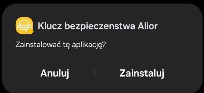 - Przestępcy mogą używać różnych nazw aplikacji, również takich które sugerują legalne źródło pochodzenia, np. „Klucz Bezpieczeństwa Alior”. Wybierz „Anuluj” – nie instaluj nieznanych aplikacji, nawet jeśli mają znaną Ci nazwę bądź ikonę. Aplikacja banku dostępna jest wyłącznie w oficjalnychsklepach (Sklep Google Play, App Store) i nie jest wskazywana jako nieznana.